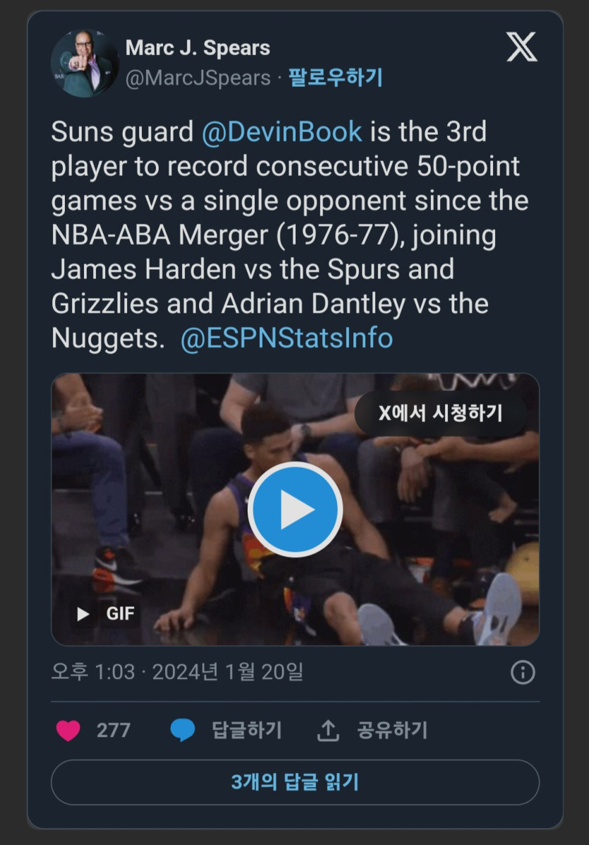 한 상대에게 연속 50득점을 기록한 세 번째 선수가 된 데빈 부커
