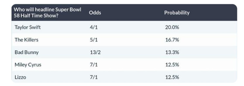 2025년 슈퍼볼 하프타임쇼 가수 배당률