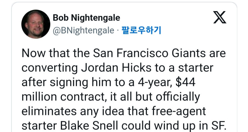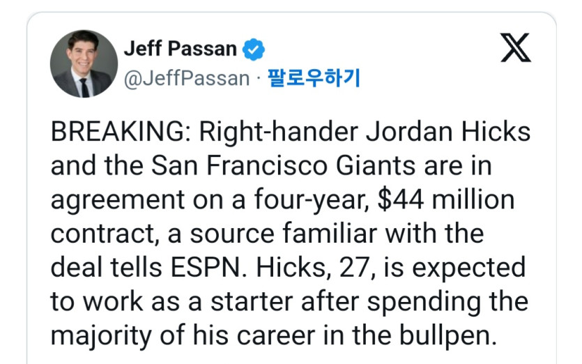 조던 힉스와 4년 44밀에 계약을 맺은 자이언츠