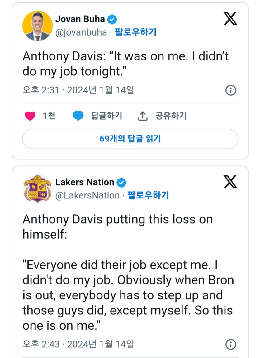AD: 오늘 경기 책임은 나에게 있다. 내가 해야 할 역할을 제대로 하지 못했다고 생각한다.
