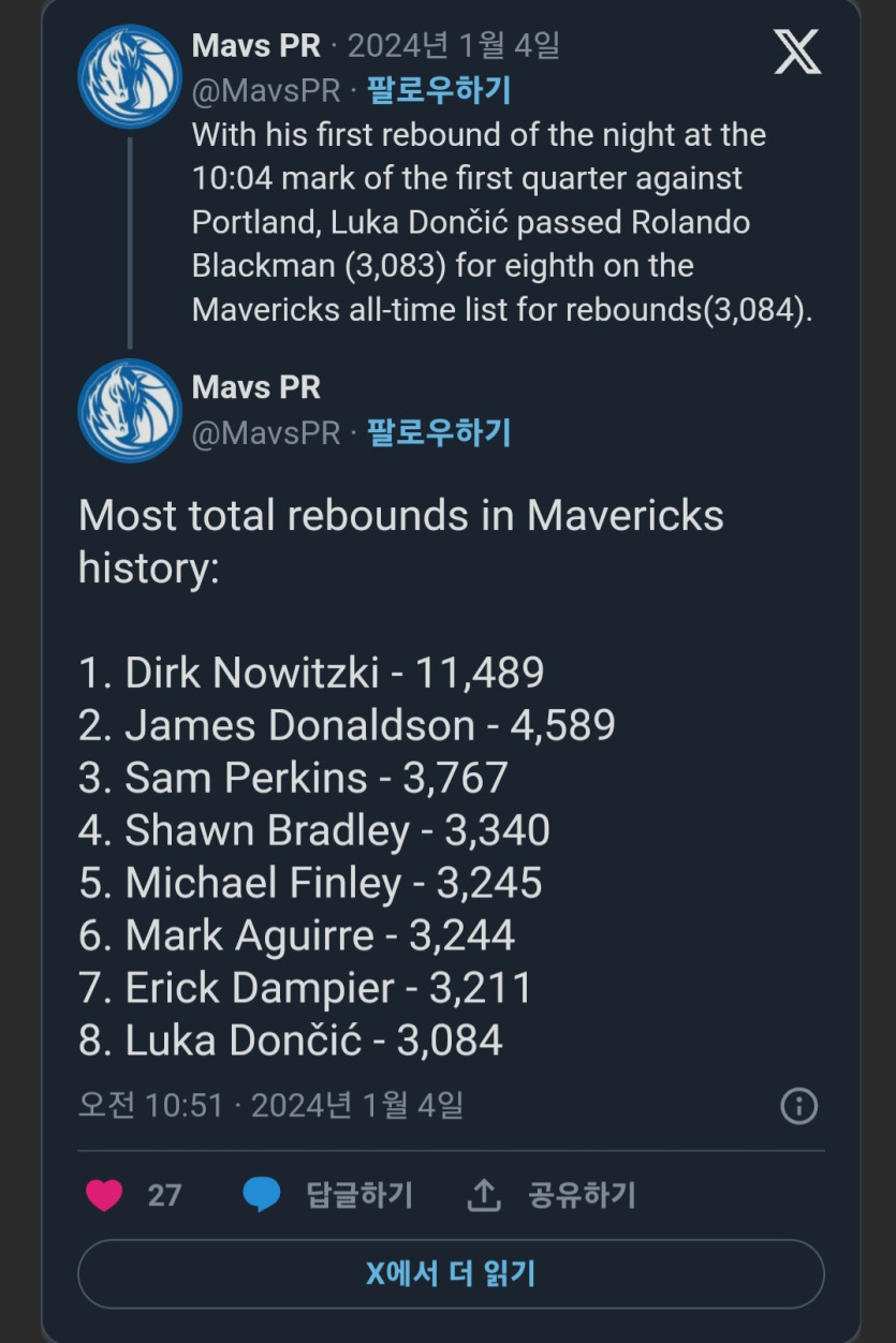 프렌차이즈 역대 리바운드 8위에 오른 돈치치