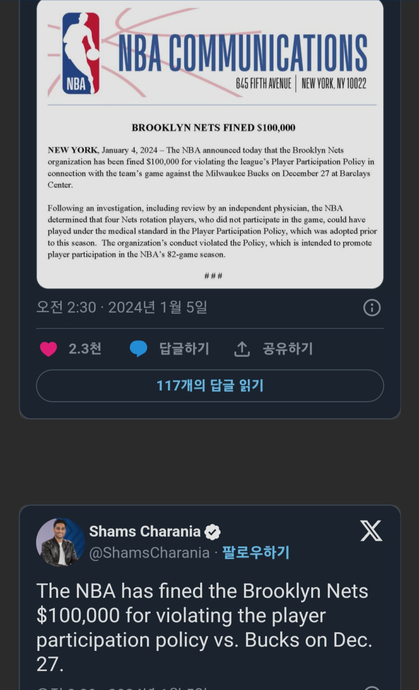 브루클린 네츠, 벌금 10만 달러 부과
