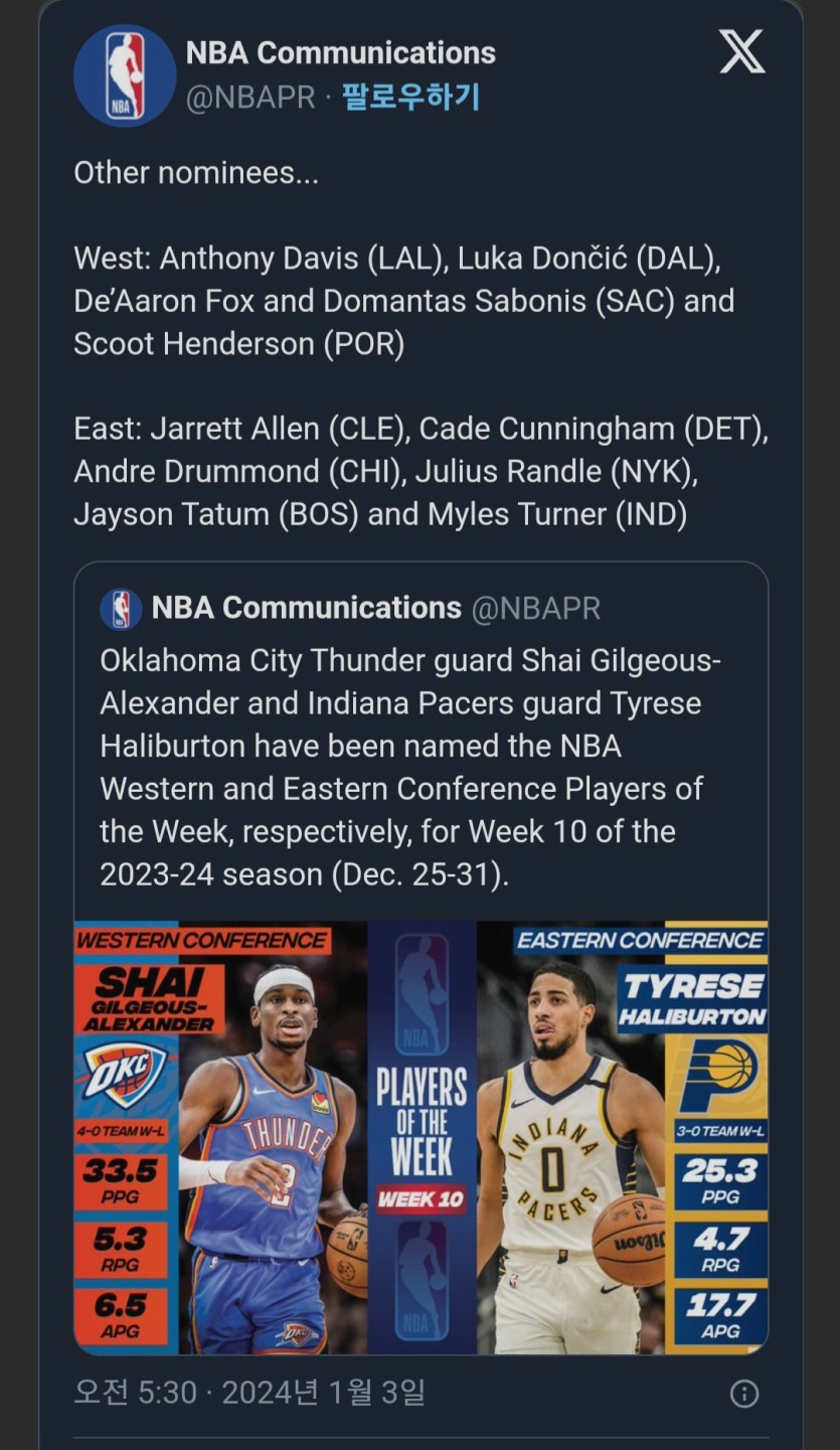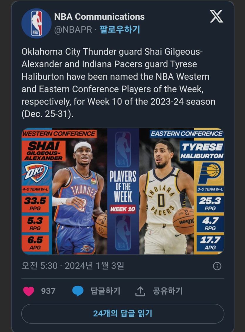 NBA 10주차 이주의 선수 - 할리버튼 SGA