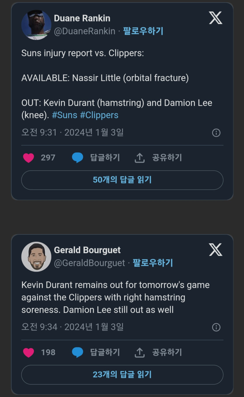 클리퍼스전 오른쪽 햄스트링 통증으로 결장하는 케빈 듀란트