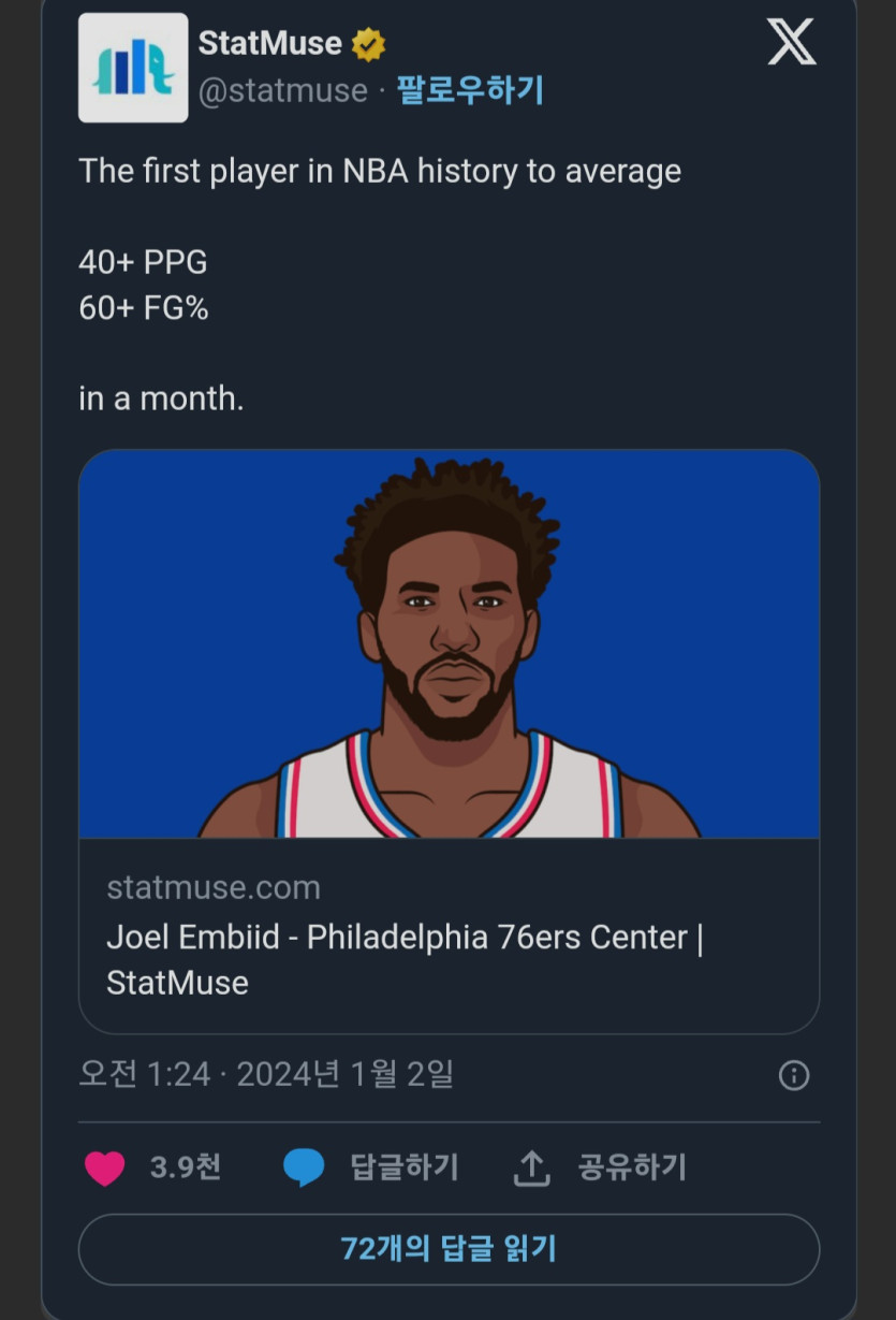 NBA 역대 최초로 한달 평균 40득점 야투율 60% 이상을 기록한 12월 엠비드
