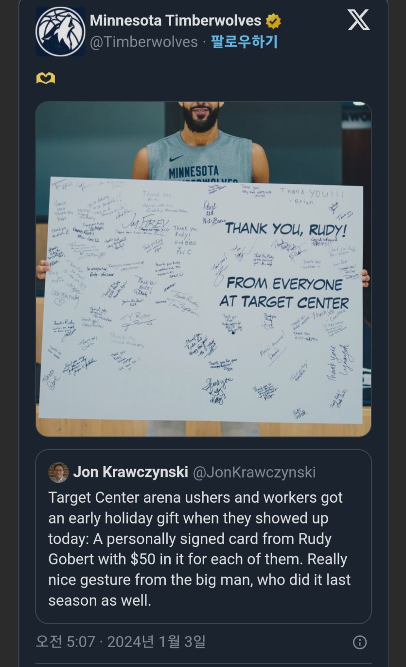 50달러가 들어가 있는 친필 사인이 담긴 카드를 경기장 안내원과 직원들에게 선물한 고베어